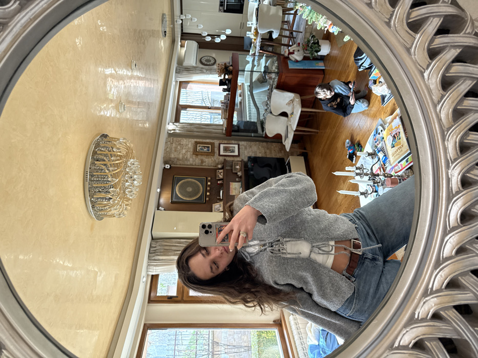 The image displays a reflection of a young adult female taking a selfie in an ornate, silver-colored mirror