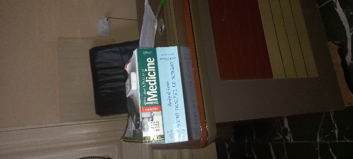 The image depicts an indoor scene, likely an office or study, located in Ojoto, Nigeria. The foreground shows a dark, possibly black, tiled floor with light-colored veining. A two-toned wooden desk with a glossy, dark brown top and a lighter brown base featuring a reddish-brown panel occupies the lower-mid frame. On the desk, a stack of two medical textbooks is prominently featured. The top book has a green spine labeled "Davidson's Principles & Practice of Medicine." Beneath it rests a book with a light blue spine, identified as "Bailey & Love's Short Practice of Surgery." A black remote control and a small white object are positioned on top of the green book. To the right of the book stack, a silver pen clip and the tip of a green pen are visible on a white sheet of paper. In the background, a black, high-backed office chair is partially visible behind the desk. The wall behind the chair is a light, uniform beige or cream color. A white electrical outlet with three pins is mounted on the wall to the right. A vertical white element, possibly a window frame or a curtain, is present on the far left. No individuals are depicted, and no specific actions or interactions are occurring.