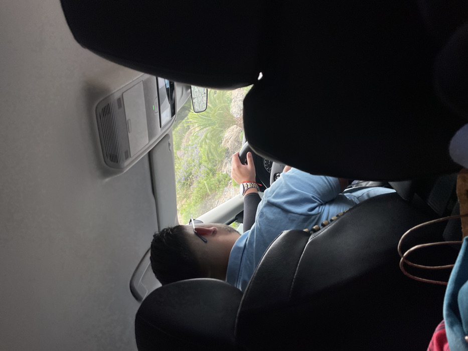 The photo was taken inside a car, from the back seat, looking forward. The driver, a man with short dark hair, is wearing a blue shirt and sunglasses. He is driving with his right hand on the steering wheel, wearing a watch on his left wrist. The right-hand side of the car is mostly obscured, but a palm tree can be seen through the window. The location of the image is in the city of Arona, Spain, based on coordinates (latitude: 28.064, longitude: -16.712).
