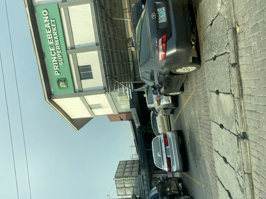 This image depicts an outdoor scene in Ilado, Nigeria, featuring the exterior of a supermarket and its adjacent parking area under a clear sky