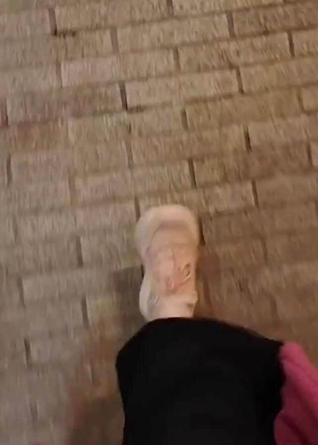 A person wearing a light-colored shoe, black pants, and a red and pink patterned top walks across a brick walkway. The video is shot from a first-person perspective, focusing on the lower body and the ground. The walkway consists of horizontally laid bricks in varying shades of gray. The camera is unsteady, shaking slightly with each step.