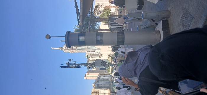 The image displays a busy outdoor pedestrian area in Makkah Al Mukarramah, Saudi Arabia, under a clear blue sky. In the foreground, the back of an individual wearing a black niqab/hijab is visible on the left, holding a black smartphone vertically in their right hand. To their immediate left and slightly behind, another individual, with their head covered by a grey hijab, has their right hand raised towards their head. A prominent, tall, cylindrical grey pole, featuring multiple rectangular reflective or transparent panels and topped with a small, spherical yellow light, stands on the right side of the foreground. At its base, several grey bollards are visible on the grey paved ground, which includes metal drainage grates. The midground shows numerous pedestrians, many in traditional white ihram attire or various Islamic coverings, walking in multiple directions on a wide paved path. A metal communication tower with multiple antennas is positioned on the left side of the frame. The background is dominated by the towering Abraj Al-Bait Clock Tower, topped with a crescent moon, rising into the clear blue sky. Surrounding the clock tower are various multi-story buildings and some palm trees, indicating a dense urban landscape. Small dark specks, likely birds, are visible in the sky. The scene depicts a bustling urban environment on a bright, sunny day.