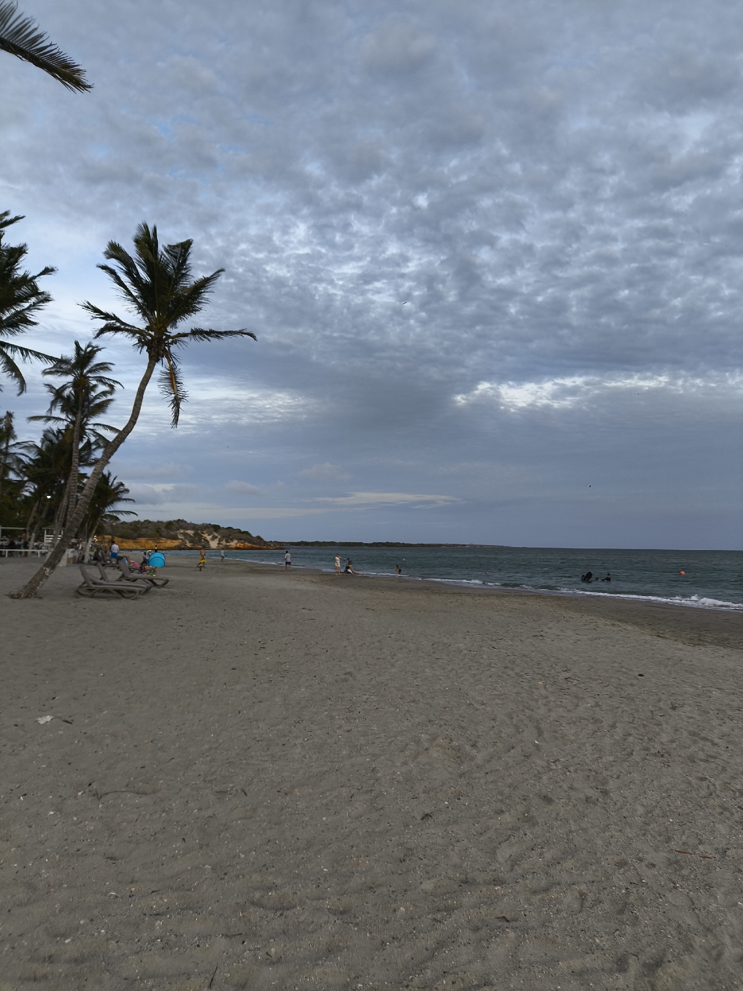 The image depicts a wide, sandy beach in El Yaque, Venezuela, under a cloudy sky. Several palm trees stand along the left side of the frame, casting shadows on the sand. Some people are scattered along the shoreline and in the water. A few beach chairs and a small blue tent are visible. The water appears calm with some gentle waves. In the background, there's a low, sandy cliff. The sand is gray-brown and stretches across the foreground.