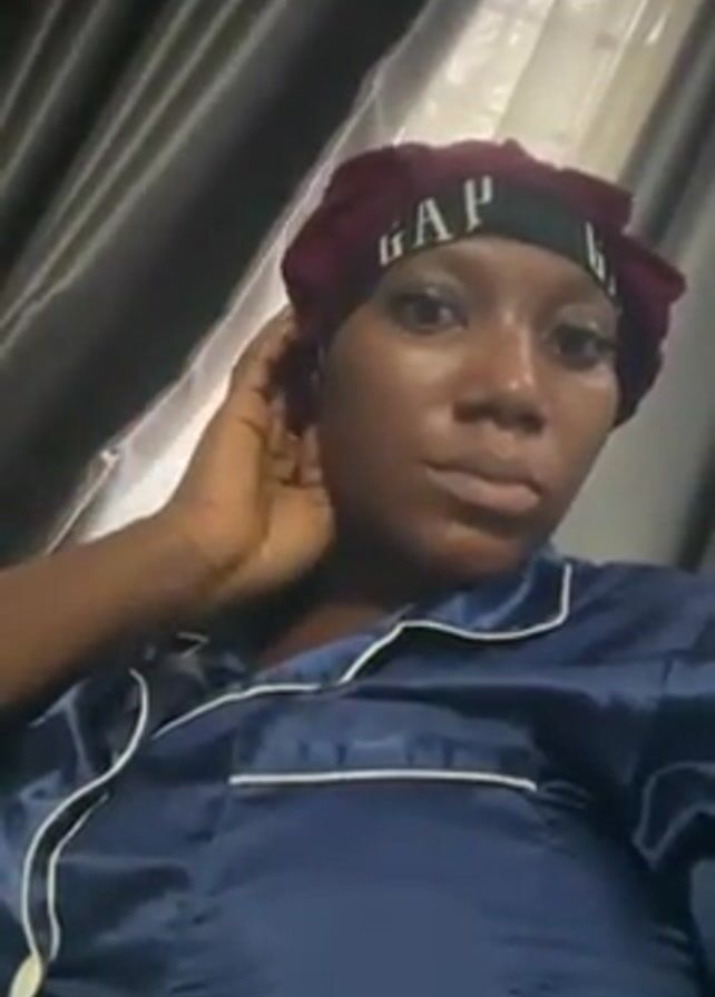 A woman with dark skin and dark hair covered by a burgundy-colored bonnet with a "GAP" logo around the rim is shown in a medium close-up view. She is wearing a navy blue pajama top with white piping. She is resting her cheek on her hand, and looking at the camera. She moves her hand slightly, then stops again with her fingers near her face. The background consists of a gray striped curtain.