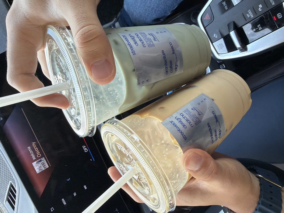 Two hands hold iced matcha lattes in clear plastic cups with straws. The cups have labels reading "streetwear design matcha architecture coffee algo fresco." One cup is light green, the other a coffee color. The background reveals parts of a car interior: a touchscreen displaying "Welcome Osyanny," climate control buttons, and other car controls. A blue watch band peeks from one wrist. The scene suggests a casual beverage stop while inside a car.