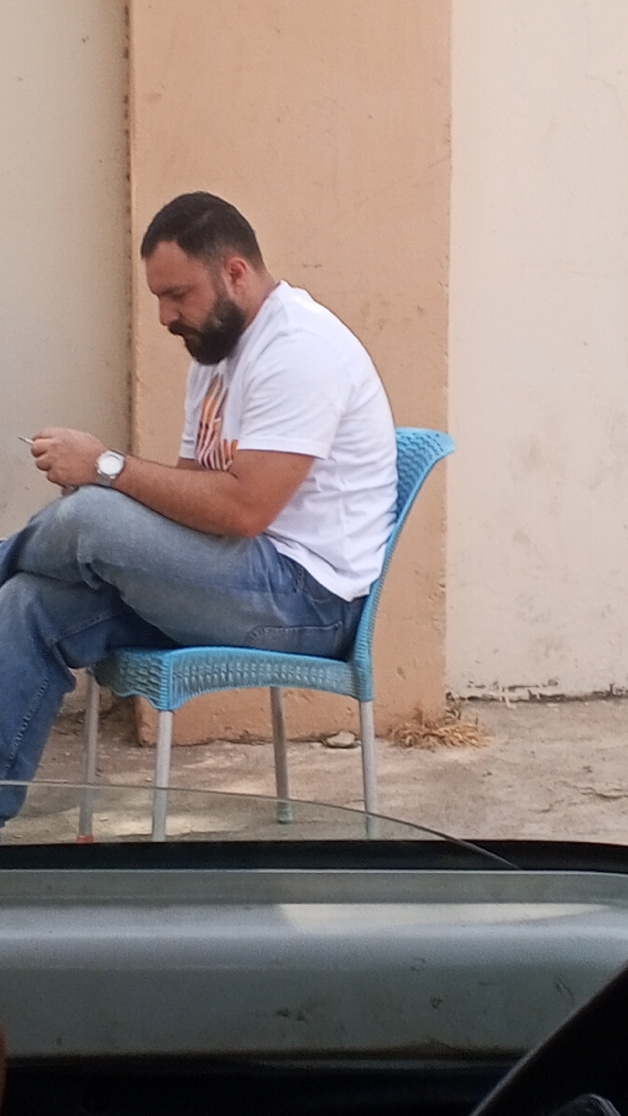 In Daurawa, Nigeria, a medium-shot image captures an adult male seated outdoors, observed from inside a vehicle. The male, with short dark hair and a full beard, wears a white short-sleeved t-shirt featuring a multi-colored graphic design on the chest and light blue jeans. A silver-toned wristwatch is visible on his left wrist. He is positioned in a light blue plastic chair with silver-colored metal legs, his legs crossed at the knee. His gaze is directed downwards at a small, dark-colored object held in both hands, consistent with a mobile phone, indicating interaction with the device. The background consists of a light brown or tan wall with a discernible vertical corner or seam separating two sections. The ground surface appears to be paved, with small clusters of dry vegetation visible at the base of the wall. The lower foreground shows the light grey interior of a vehicle, specifically the top portion of a door panel or dashboard, suggesting the photograph was taken from within a car.