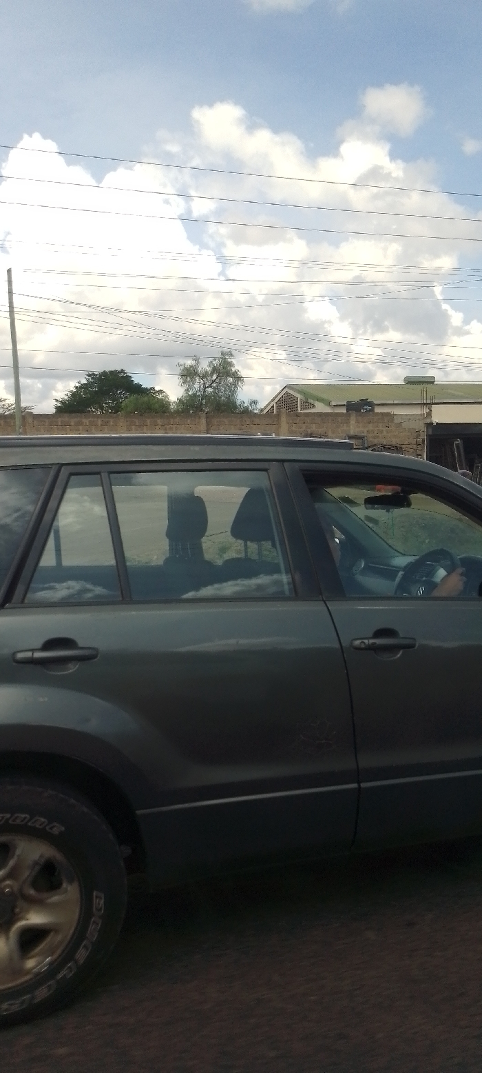 The image depicts a dark-colored, possibly dark green, four-door SUV viewed from its left side on a road in Matathani ward, Kenya
