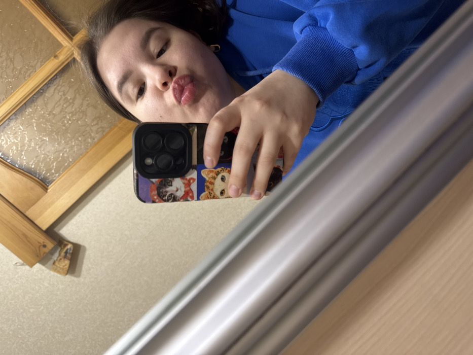 A female individual is depicted in a mirror selfie, captured indoors within a residential environment in Nizhnekamsk, Russia. The subject, visible in reflection, has dark hair and is attired in a blue hooded sweatshirt. Her lips are pursed in a "kissing" gesture. A small, gold-colored hoop earring is present on her right earlobe. She holds a smartphone, characterized by its black frame and triple-lens rear camera array, in her right hand. The phone case displays a multicolored design featuring cartoon cats, including one in a red hood and another exhibiting heterochromatic eyes. The background, also reflected in the mirror, consists of a light beige wall. In the upper right quadrant, a section of a wooden door or window frame with textured glass is visible. An irregular, light-colored piece of wood, possibly detached trim, is situated near the top of the wooden frame. A reflective, silver-toned diagonal bar occupies the lower-left portion of the image.