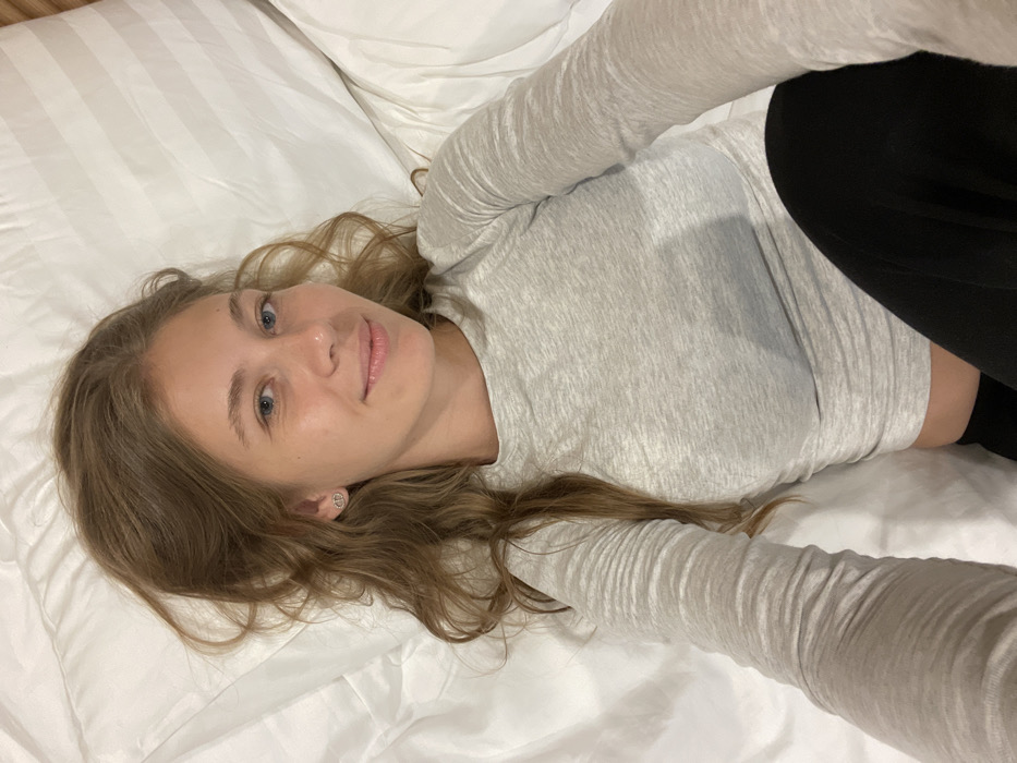 - "An overhead photograph depicts a young female lying supine on a bed" by FM-sq6qa2, licensed under CC BY 4.0