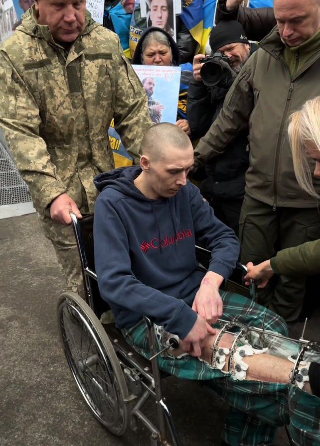 The scene captures a person in a wheelchair, escorted by two individuals, navigating through a crowd. The person in the wheelchair is wearing a dark blue hoodie. The crowd includes people holding signs and banners, and several individuals are actively recording the event with their phones. The atmosphere appears to be a mix of concern and solidarity, possibly associated with a public event or demonstration.