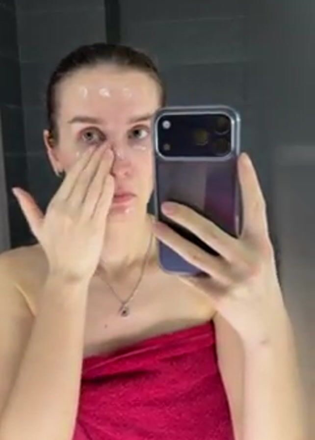 In a medium shot, a woman stands in front of a mirror, recording herself with a smartphone. She's wrapped in a magenta towel, her hair is pulled back, and she is wearing a delicate silver necklace. She has applied dots of white cream on her face. With her right hand, she gently rubs the cream into her skin, starting from her cheeks and moving towards her eyes and forehead. She holds the phone in her left hand, keeping the camera focused on her face. The background is a gray-toned wall, likely in a bathroom or dressing area.