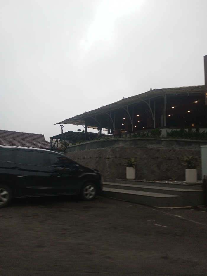 The scene depicts an exterior view in Ciloto, Indonesia, under an overcast sky. A large, multi-level building, likely a restaurant or commercial establishment, dominates the background, situated atop a stone retaining wall. This primary structure features an expansive, dark, sloped roof supported by a visible framework, with its interior lights illuminated and visible through open sides. Below the main building, a substantial retaining wall constructed from dark, irregularly shaped stones supports the elevated structure. A wide, dark-colored staircase ascends the retaining wall towards the building. Two light-colored cylindrical planters, each containing green foliage, are positioned on ledges along the retaining wall near the steps. In the foreground, a dark-colored minivan or compact SUV is partially visible on a paved surface, oriented towards the right. To the far left, a section of another building with a reddish-brown tiled roof is visible. No individuals are present within the frame.