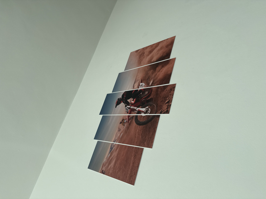 The image presents a light-colored interior wall, meeting a ceiling at an obtuse angle in the upper portion of the frame. Mounted on this wall is a five-panel split canvas print, arranged horizontally with minimal spacing between panels. The artwork depicts a high-action motocross scene. A prominent rider, dressed in dark full-body motocross gear including a helmet with a visor and goggles, is positioned on a red dirt bike, oriented towards the right. The rider is actively maneuvering, causing substantial reddish-brown dust to billow from behind the bike. A second rider on a dirt bike is partially visible in the mid-ground to the left of the primary subject. The environment within the print is characterized by reddish-brown, dusty terrain with visible hills or dunes under a light blue sky. No visual information is present within the image to indicate the physical location of the wall or room in the city of Kardzhali, Bulgaria, or any specific geographic location.
