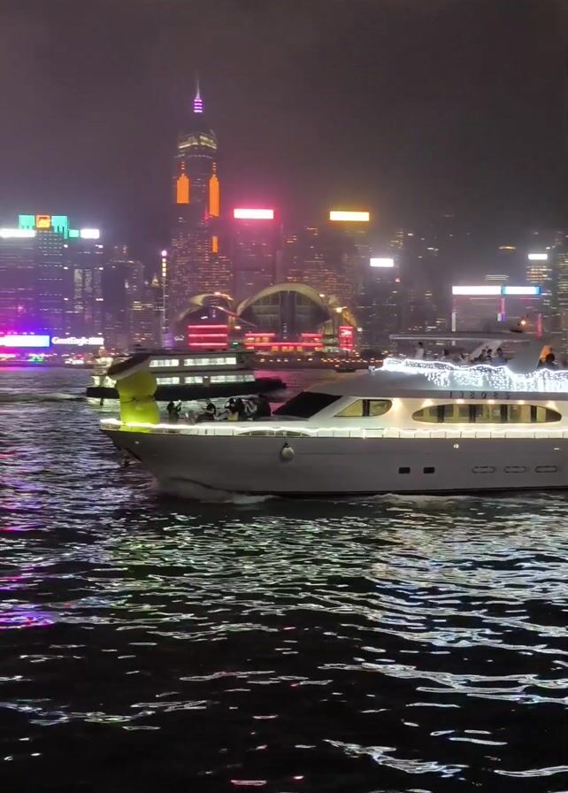 white yacht cruising through water at night with a cityscape in the background. The yacht is decorated with lights and has people visible on deck. The buildings in the background are illuminated with various colors. The water reflects the lights from the city and the yacht, creating a shimmering effect.
