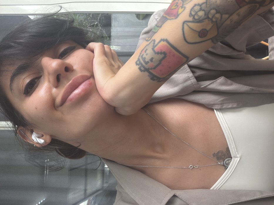 A female individual is depicted in a close-up, chest-up portrait, gazing directly at the viewer with a slight smile. Her dark hair is styled with bangs across her forehead, and a white earbud is visible in her left ear, along with an ear cuff. She wears winged eyeliner and has a small blemish on her lower lip. Her right hand supports her chin. She is dressed in an open, light-colored collared shirt over a white tank top. A silver-colored chain necklace with a circular pendant rests on her chest, above a faint crown tattoo outline on her sternum. Her right forearm is extensively tattooed with various colorful designs, including a pixelated red and white cat figure and a yellow envelope. The blurred background indicates an indoor or semi-outdoor setting with a large window displaying reflections and faint green foliage. The scene is located in Nusa Dua, Indonesia.