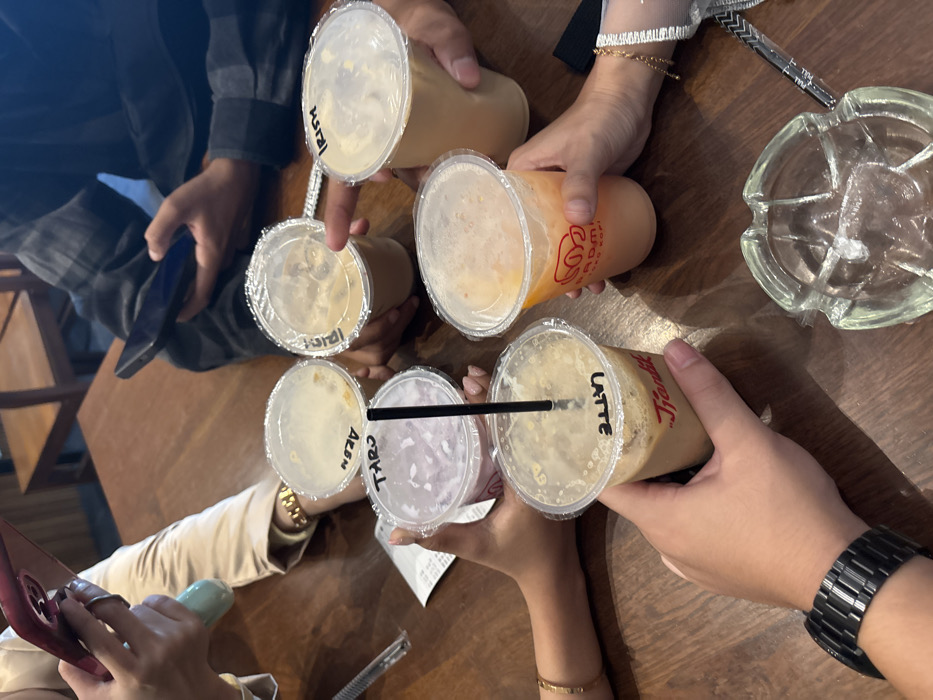 A group of people sits around a wooden table, holding six various drinks in plastic cups. The drinks appear to be cold beverages with labels like "Irish," "Latte," "Taro," and "Alen" written on the cups. One person holds a black phone, another holds a pink phone. An ashtray sits on the table near the drinks. The hands holding the drinks wear accessories like bracelets and watches.