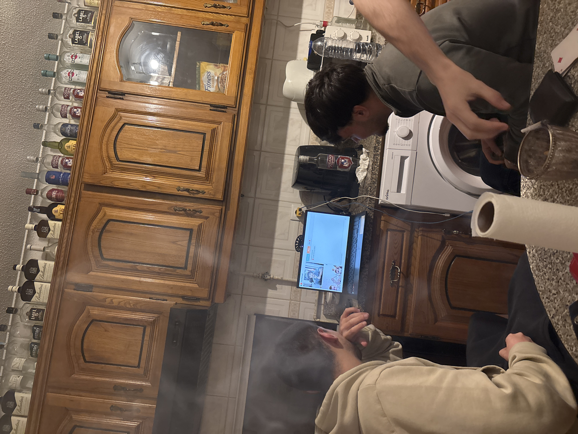 This image depicts an indoor scene within a domestic kitchen located in Bragança, Portugal. Two male individuals are partially visible, seated and focused on a laptop screen. The person on the left is viewed from behind, wearing a light beige hoodie, with his right hand near his chin, appearing engrossed in the laptop's content. The person on the right is seen in profile, wearing a dark grey zip-up jacket, looking towards the laptop. A third individual's right arm and hand are visible in the extreme foreground, reaching towards objects on a table. The kitchen features light-brown wooden cabinetry with dark outlining on the doors and a tiled backsplash. A collection of assorted liquor bottles, including brands like Ballantine's, Label 5, Rodano Original, and Smirnoff, is displayed atop the upper cabinets. A black range hood is situated below the left cabinets. The countertop holds a laptop displaying a video call interface labeled "Chat Portugal", a black air fryer, a bottle of Rodano Original Vodka, a white toaster, a plastic water bottle, and associated cables. A white "Arima" brand washing machine is positioned next to the countertop. In the foreground, on a grey speckled surface, are a roll of white paper towels, a metallic ashtray containing a cigarette butt, a black wallet, and several white cards. A noticeable haze or smoke is present in the air, particularly in the upper left and central portions of the image.