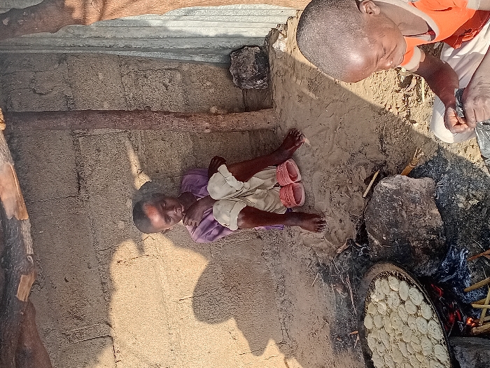 A young child in a purple shirt and light pants sits on a dirt floor, wearing pink sandals. An older person, likely cooking, is to the right, wearing orange. A flat pan is filled with small, round food items on a fire. A stone and tinder are beside it. The scene seems to be inside a simple dwelling, built of mud brick, with a rustic wooden beam and corrugated iron roofing. The image is rotated, rendering the composition unusual.