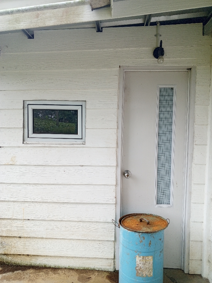 An exterior shot shows a white building with horizontal siding. A small, dark-framed window sits left of a white door with a glass panel. Above the door, an exposed lightbulb hangs. A blue trash can with a rusty lid sits at the base of the door. The ground is partially visible at the bottom left, and the building's eaves are partially visible at the top. The wall and door appear weathered.