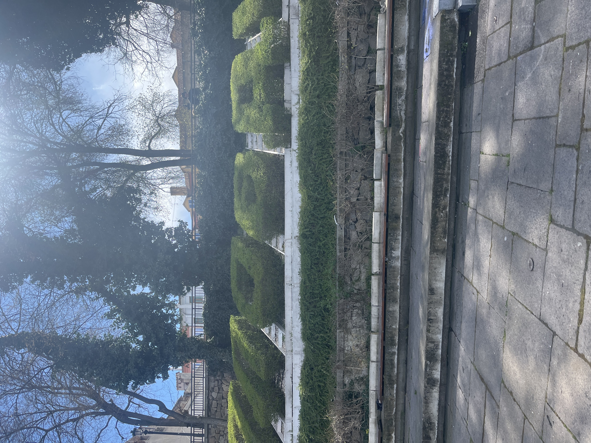 The image displays an outdoor scene located at Sahat Tepe in Plovdiv, Bulgaria. The foreground consists of large, grey square flagstones, leading up to a series of concrete steps and platforms that incorporate several wooden benches. A dark object, possibly a bag or clothing item, rests on the leftmost visible bench. Above these platforms, an embankment rises, featuring a layer of dense green ground cover followed by a white concrete structure. Upon this structure, large, precisely trimmed green hedges spell out the word "ПЛОВДИВ" in Cyrillic script. Behind the hedges, a stone retaining wall topped with a black metal railing runs horizontally across the frame. Above this railing, a single individual is discernible as a dark silhouette, standing near the center-right. The background is dominated by mature trees, some with full green foliage, others deciduous with bare branches, silhouetted against a bright blue sky with scattered clouds. Sunlight produces a significant lens flare in the upper central portion of the image. Portions of buildings with light-colored facades and terracotta tile roofs are visible through and above the trees and railing.