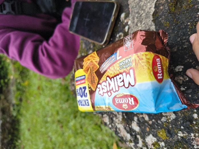 A partially unwrapped package of Roma Malkist crackers lies on a textured surface. The packaging features the words "Malkist" and "Roma," along with "Extra Abon 20%". The dominant colors are brown, yellow, and blue. A smartphone sits nearby, and a portion of a person's arm in a purple jacket is visible. A patch of green grass is in the background. The surface appears to be either stone or concrete. A hand is visible on the right side of the frame.