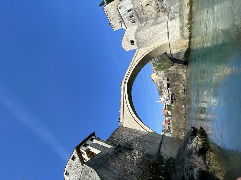 - "An eye-level shot captures the Stari Most (Old Bridge) spanning the Neretva River in Mostar, Bosnia and Herzegovina, under a clear, bright blue sky with a faint contrail visible in the upper center" by FM-oln9s2, licensed under CC BY 4.0