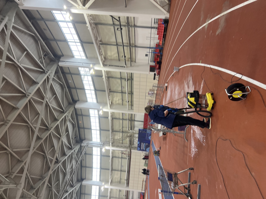 This image presents an interior view of an indoor athletic facility in Tashevka, Russia. The scene is dominated by a red track surface with white lane markings, encompassing a large, well-lit space. The ceiling consists of a complex network of light-colored metal trusses supporting a corrugated roof. The upper sections of the walls feature multiple rectangular windows allowing ambient light, supplemented by wall-mounted artificial lighting fixtures. In the foreground, a single individual, a female wearing a dark blue short-sleeved top, dark trousers, and light-colored athletic shoes, is actively engaged in cleaning the track. She is wearing blue gloves and operating a yellow and black wet/dry vacuum cleaner with a metal drum, using a long hose attachment to suction white, foamy residue from the track surface. A black power cord extends from the vacuum, connecting to a black cable reel with yellow accents positioned on the track in the lower right. To the left of the cleaning operation, a silver-colored shopping cart is visible on the track, near what appears to be a hurdle. The midground and background include elements characteristic of an athletic arena. Several metal barriers and hurdles are visible along the track. In the far background to the left, a blue mat area is present, with several indistinct figures seated or standing nearby. Along the right side of the track, red tiered spectator seating is visible. A tall, light-colored metal structure, possibly scaffolding or a support column, stands in the left midground. Another small yellow and black cleaning machine is situated further down the track on the left. The scene depicts an ongoing maintenance activity within the sports complex.