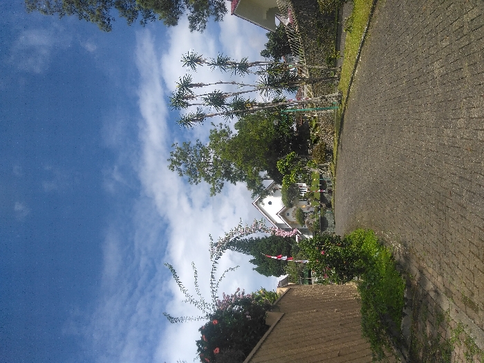 This image displays a daytime outdoor scene on a paved road within what appears to be a residential or resort area in Cipanas, Indonesia. The sky above is largely clear blue with scattered white cumulus clouds. In the foreground and extending towards the mid-ground, a dark gray paved road, constructed from interlocking bricks, stretches forward and curves slightly to the right. Along the left side of the road, a light brown, textured wall runs horizontally. Beyond this wall, dense green foliage and trees with some reddish blooms are visible. Further along the left, a prominent white house with a multi-gabled roof and dark windows is situated amidst extensive green landscaping. A flagpole displaying a red and white flag, consistent with the Indonesian national flag, is positioned in front of this white house. Tall, dark green coniferous trees stand behind and to the left of the house. On the right side of the paved road, a narrow strip of green grass precedes a row of several tall, slender trees characterized by rough trunks and sparse, spiky foliage concentrated at their tops, resembling a variety of palm or Dracaena. A fence line is partially visible between these trees. In the far right background, a second building with a reddish-brown roof is partially visible. No individuals are present in the scene.
