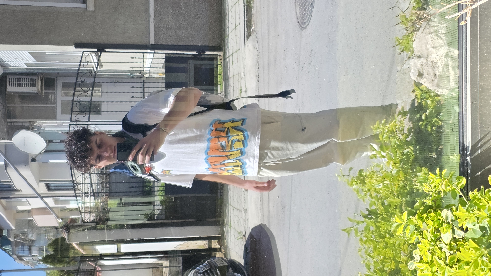A young man is seen in the reflection of a glass window in the city of Dobrich, Bulgaria. He has curly dark hair and is holding a smartphone, likely taking a selfie. He is wearing a white t-shirt with a colorful design and light-colored pants. Reflected in the window are elements of an urban environment, including buildings, a wrought iron fence, a satellite dish, and a parked vehicle. The surroundings also include greenery, particularly visible along the edge of the window frame.
