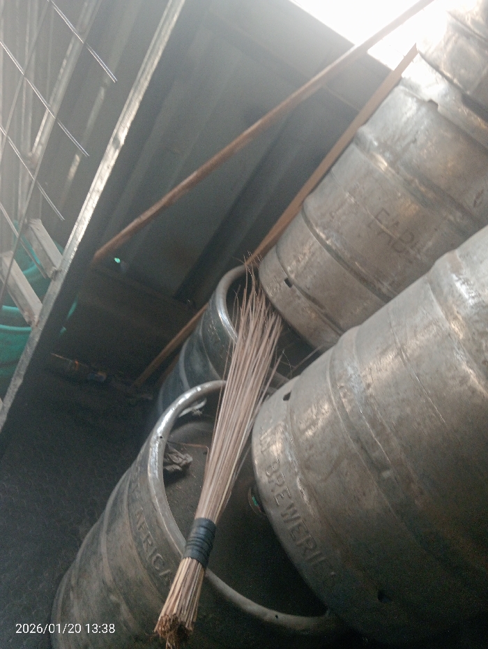 The image displays a storage area within the city of London ward, Kenya. Prominently featured are multiple metallic beer kegs. One keg in the foreground is marked "EAST AFRICA," another shows "BREWERIE," and a third visible keg displays "EABL," consistent with East African Breweries Limited. A natural fiber broom, secured with black tape, rests against or on one of the foreground kegs. The overhead structure consists of a grey metallic surface, with a light brown metal bar extending across the upper-mid section. To the left, a metallic structure with a visible wire mesh grid is present. A bright light source from the upper right casts a glare. The floor or ground surface, partially visible in the lower left, is dark and textured. No individuals are depicted.