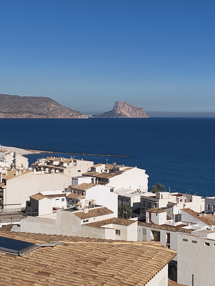 A sunny view overlooking white buildings with terracotta roofs, stretching towards a blue sea. A rocky land mass appears on the left horizon, while a prominent, taller rock formation rises from the sea in the middle distance. A breakwater structure is visible along the shoreline, adding depth to the coastal landscape. The sky is clear and blue.