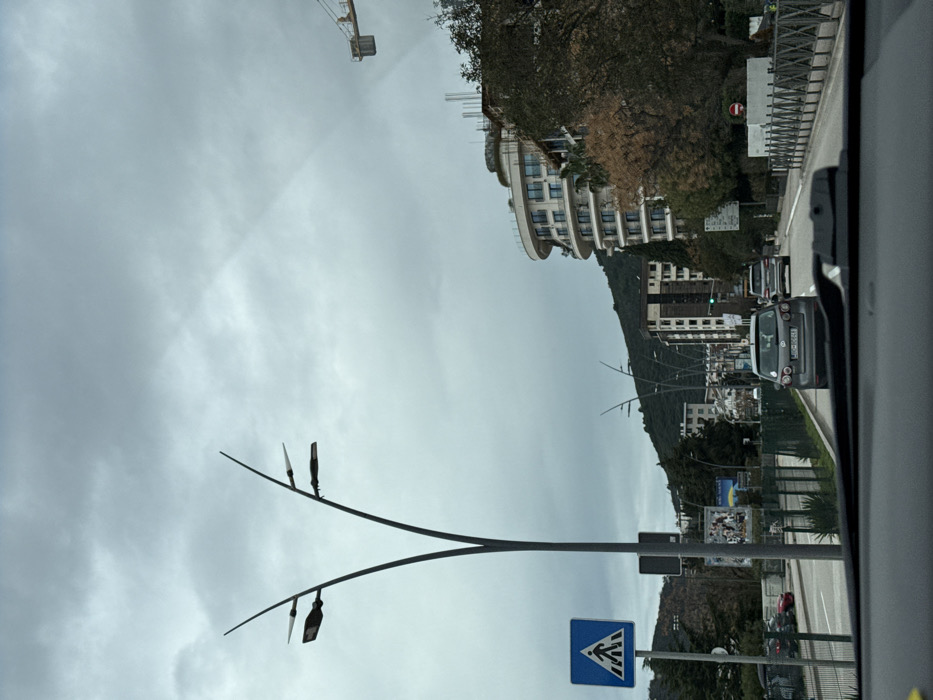 The image displays an urban street scene in Budva, Montenegro, captured from the interior of a vehicle on an overcast day. The sky is uniformly grey with dense cloud cover. The immediate foreground reveals the dashboard and a portion of the windshield of the camera's originating vehicle. A multi-lane asphalt road extends into the distance, with a central reservation bordered by green metal fencing. In the center lane ahead, a dark grey hatchback, identified by its Montenegrin license plate "BD 006-LL", is stationary or moving slowly. A lighter-colored sedan is visible directly behind it, with additional vehicles further down the road. On the left side of the road, a tall, stylized street light with two upward-curving arms, each supporting a rectangular light fixture, stands next to a blue square road sign indicating a pedestrian crossing. Further down the left, a large billboard with an advertisement is visible. On the right side of the road, a similar green metal fence separates the roadway from a sidewalk and trees. The background features a mix of urban architecture and natural terrain. On the right, a distinctive, light-colored multi-story building with a curved, tiered facade is prominent. Elements at its upper levels suggest ongoing construction or recent completion, and a yellow construction crane is partially visible above it on the far right. Various other multi-story buildings, some with darker facades, line the street. Green, tree-covered hills rise behind the city buildings. A green traffic light is visible in the distance on the right. No individuals are clearly discernible within the frame.