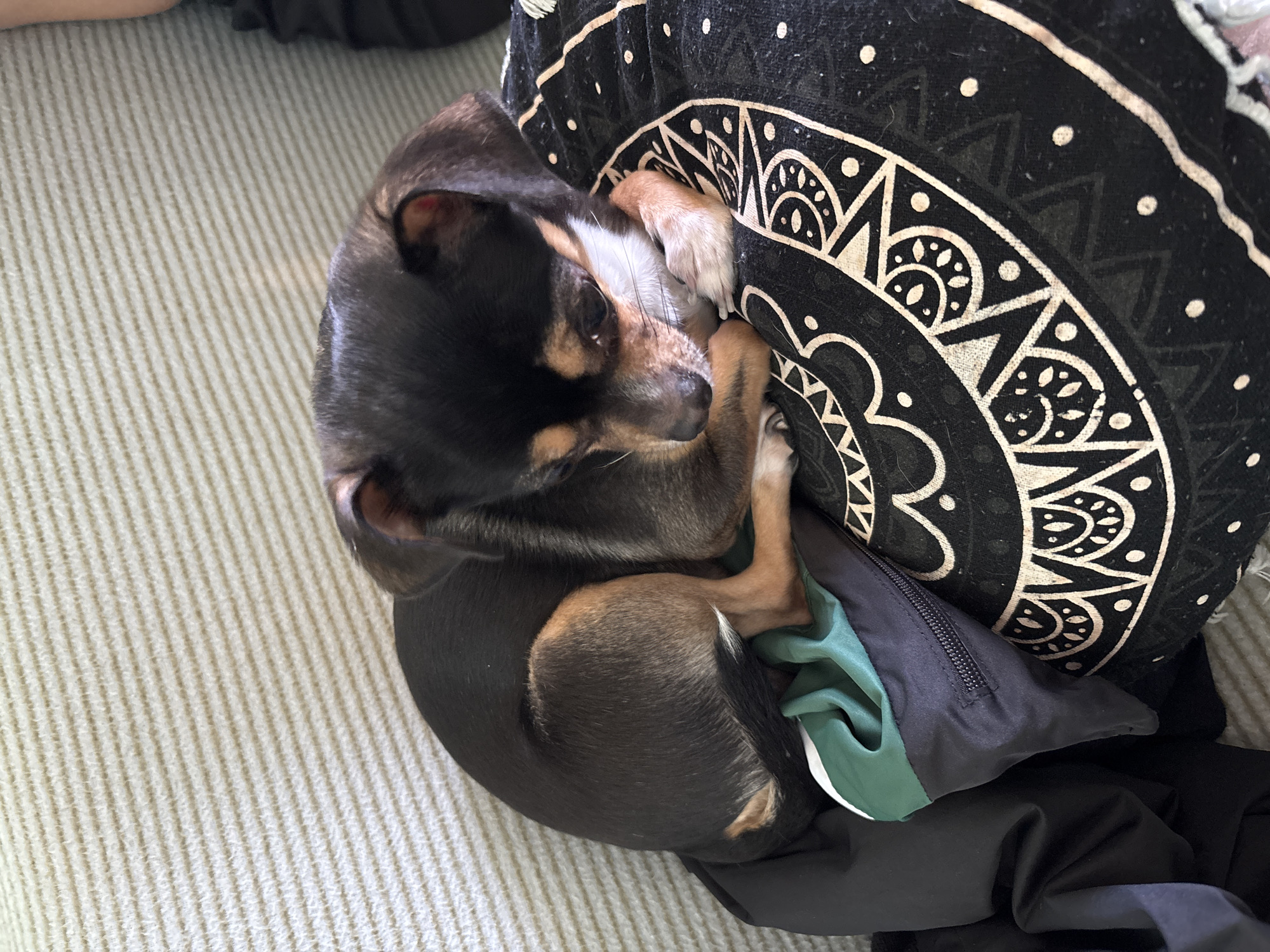 - "A small, tan and black Chihuahua dog is curled up on a black and white patterned round pillow and a dark-colored bag with green and white accents" by FM-X6B8P2, licensed under CC BY 4.0