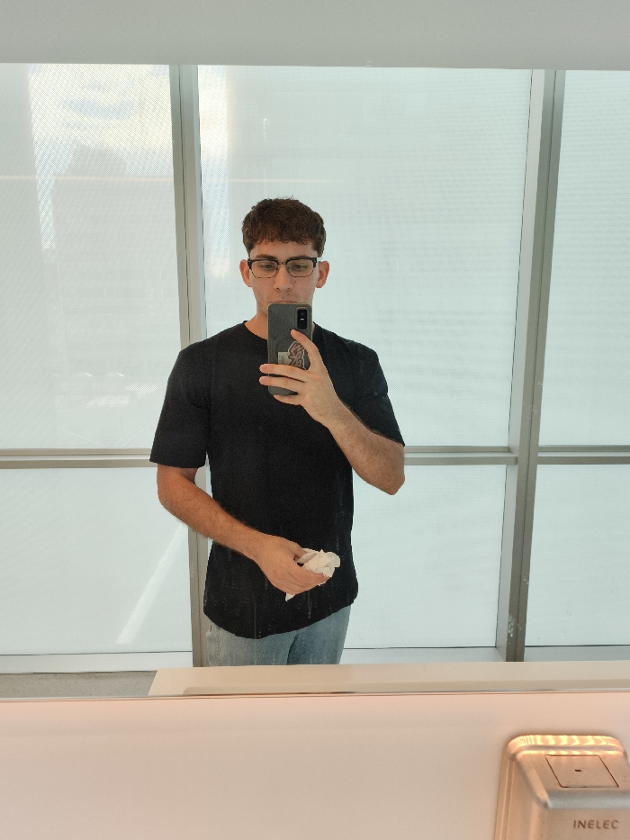 - "A man with short brown hair and glasses takes a mirror selfie in a public restroom" by FM-Ro4Ul2, licensed under CC BY 4.0