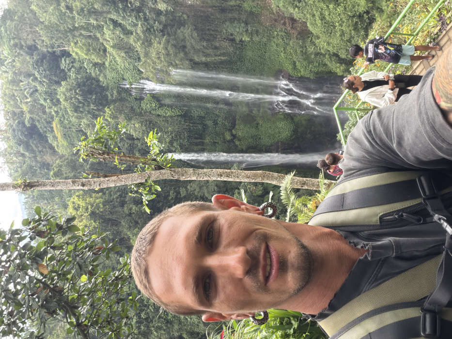A man poses for a selfie in front of a waterfall. He has short blond hair and large, decorative ear gauges. He wears a grey shirt with straps and a backpack. Behind him, lush green foliage covers the landscape with several streams of water flowing down. Other people stand on a viewing platform to the right of the frame, enjoying the waterfall views.