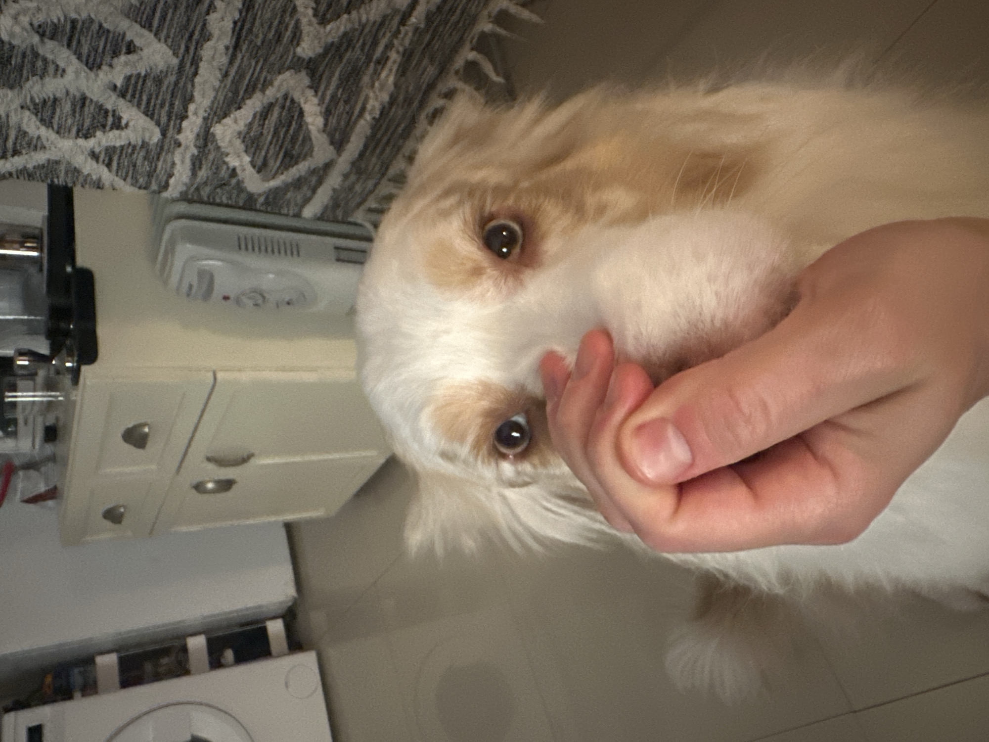 A tan and white dog is being petted by a fair-skinned hand. The dog is near a white cabinet with drawers, on which sits a smoke detector and a gray patterned rug. A washing machine is also visible. The location is Ramat Gan, Israel.