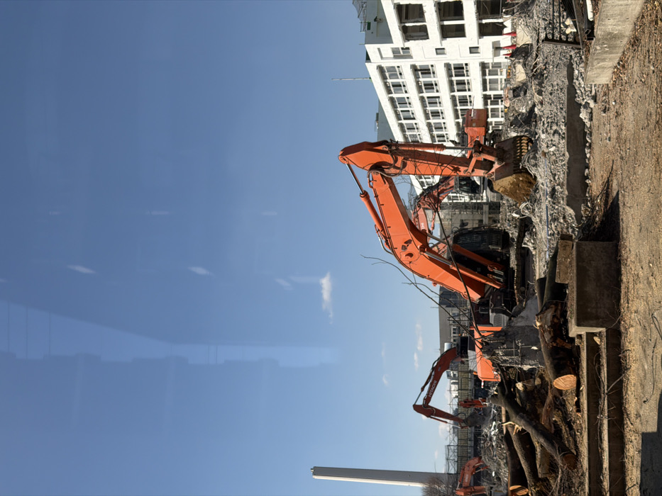 Orange excavators work at a construction site. The machines are surrounded by rubble and debris from a partially demolished white building. Cut tree trunks lie on the ground alongside a concrete structure. Above, a clear blue sky fills the majority of the frame. The image appears to be taken from a ground-level perspective.
