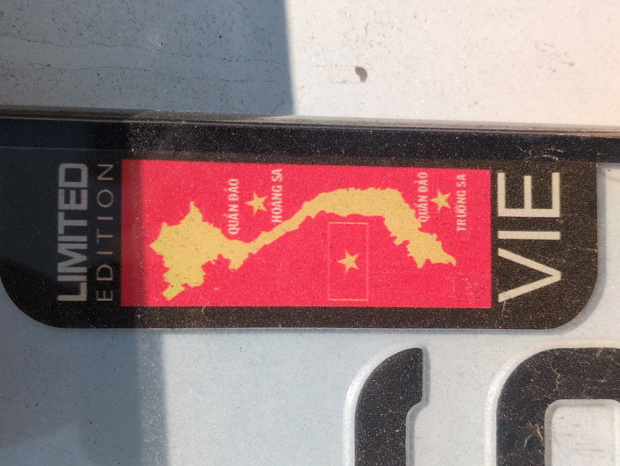 detail of a car license plate sticker with the words "LIMITED EDITION" and "VIE" visible on either side of a rectangular red field. The red field contains a gold-colored map of Vietnam with a star in the center. The words "QUAN DAO HOANG SA" are above the map, and "QUAN DAO TRUONG SA" are to the right of the map. The sticker is affixed to a light-colored surface. The scene appears to be in a state of neglect, the license plate appears to be dusty. There is insufficient information to determine the location within South Quy Nhon Ward, Vietnam.