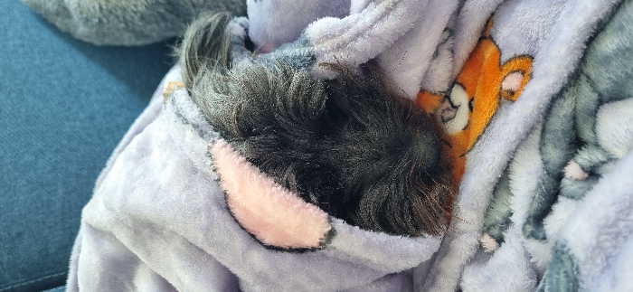 - "A dark, possibly gray, furry animal is nestled in a light purple blanket with cartoon animals" by FM-rGZrc2, licensed under CC BY 4.0