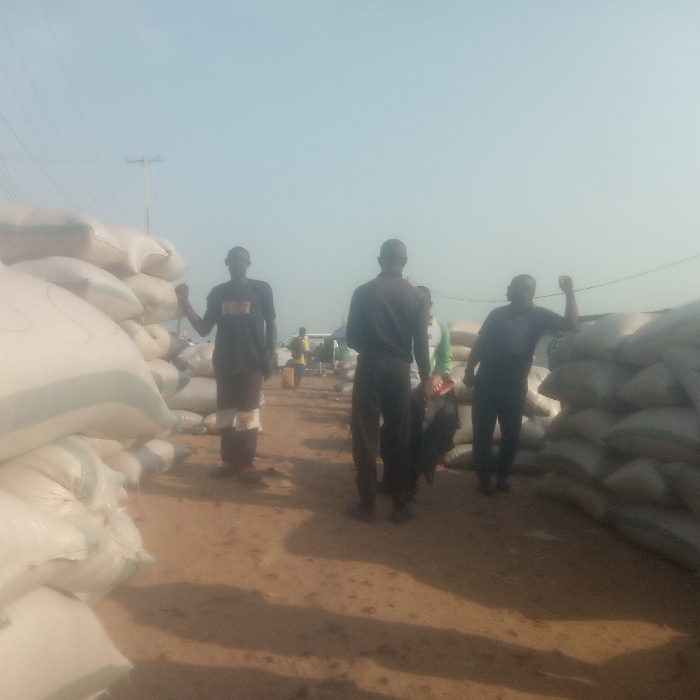 - "Three men stand on a dirt road flanked by large stacks of white sacks" by FM-WTCgo2, licensed under CC BY 4.0