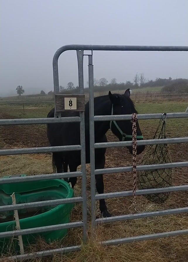black horse standing inside a metal gate. The gate has a sign with the number 8 on it. There is a green plastic water trough next to the gate. A hay net is hanging from the gate, and the horse appears to be eating from it. A dog is also visible in the frame, standing outside the gate. The background is a field, and the weather appears foggy. The video is shot from an outdoor perspective.