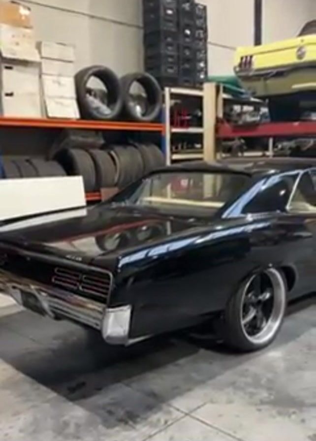 back of a shiny, black Pontiac GTO parked in a garage. Shelving with tires and boxes line the wall behind the car. A yellow Ford Mustang is elevated on a lift in the background. The camera pans slightly to the right. The garage floor is a light concrete color. The video seems to be taken in a professional auto garage or workshop setting.