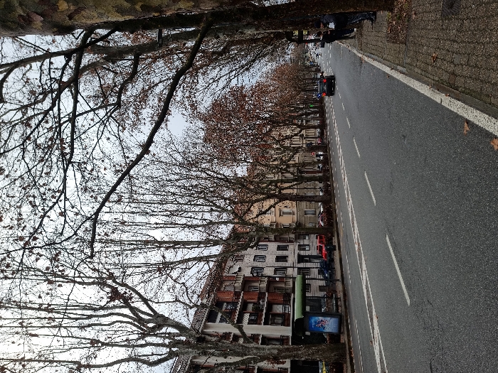 An eye-level view of a city street lined with bare trees in late fall or winter. Buildings stand behind the trees. A road runs along the right side, marked with white lines, and some cars are present. A sidewalk is visible next to the road. The overall tone suggests a quiet, urban scene during a colder season.