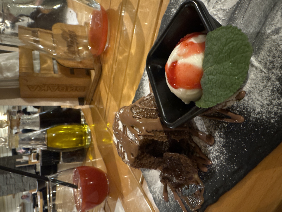 The scene depicts a close-up view of a dessert and beverages on a wooden table inside a Divaka restaurant in Sofia, Bulgaria