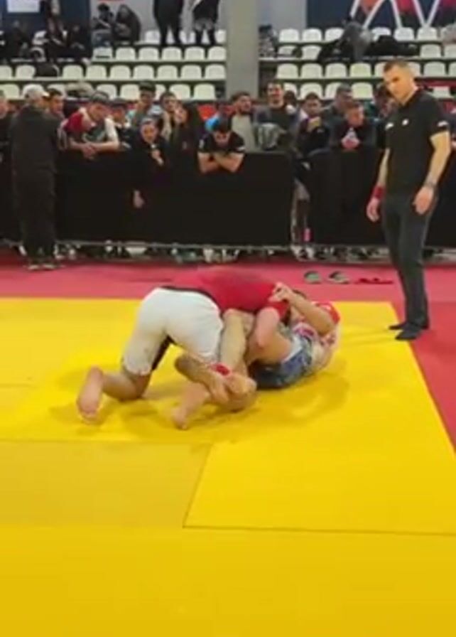 Two men are wrestling on a yellow and red mat in what appears to be a sports arena. The man on top is wearing a red shirt and white shorts. The man underneath is wearing patterned shorts. A referee stands nearby, watching the match. The area around the mat is filled with spectators sitting and standing, observing the competition. Banners and advertisements line the walls of the arena.