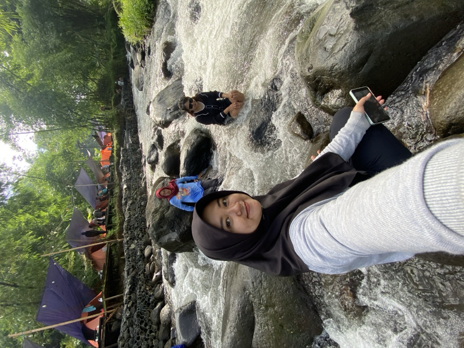 A river scene includes three people. The closest, wearing a hijab, holds a cell phone. Further away, a person in blue sits on a rock. Further still, another person in dark clothes sits on a rock. To the left, there is a campsite. A river runs throughout the scene over rocks. Trees are also visible on the left.