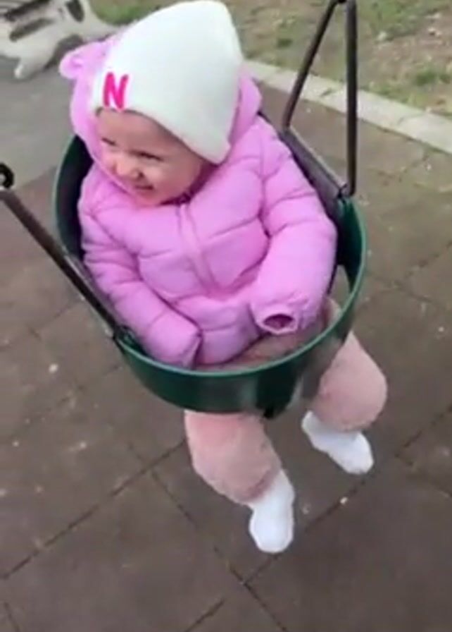 The video depicts a baby sitting in a green swing on a playground. The baby is wearing a pink winter jacket and pink pants, a white beanie with a pink “N” on it. The ground under the swing is made of gray safety tiles. The swing is attached to a green metal frame with chains. The baby is smiling, laughing and looks around. The camera is positioned close to the swing.