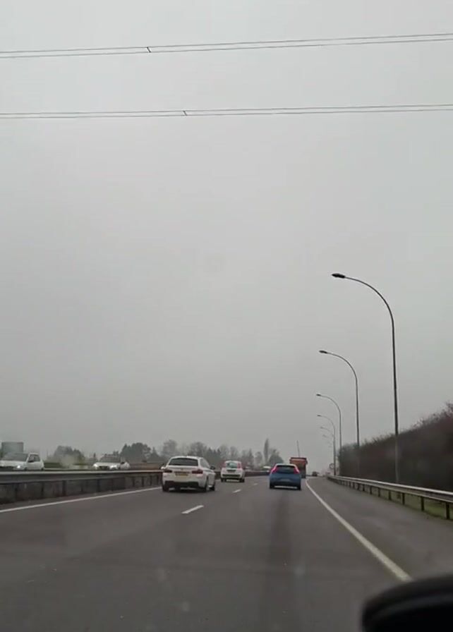 car driving down a highway on a cloudy day. There are several other cars on the road, including a white car, a silver car, and a blue car. The highway has two lanes, and there are streetlights along the side of the road. There are also signs indicating a speed limit of 70. The video is taken from the perspective of the driver of the car.