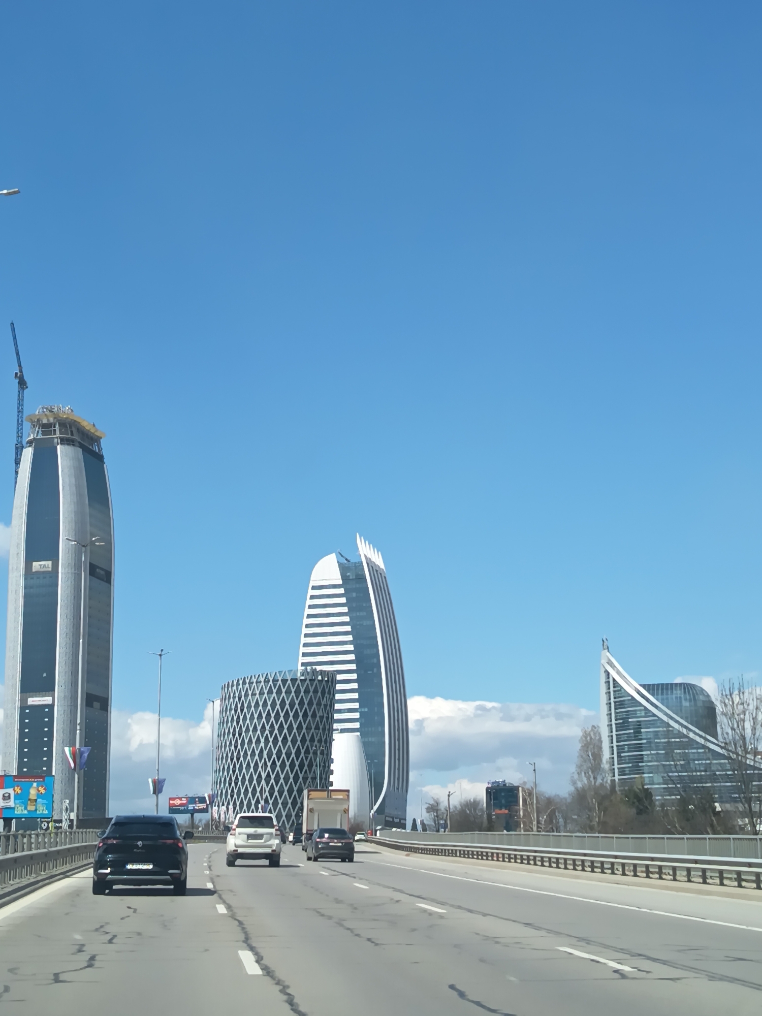 four-lane highway leading towards a group of modern buildings in Sofia, Bulgaria. On the left side of the road, a tall skyscraper under construction is visible, with a crane on top. Further along the road, there are two other prominent buildings: a smaller, geometric patterned building and a taller, white and black striped tower. A fourth modern building is visible in the distance on the right. Three vehicles are seen traveling on the highway: a black car in the foreground, followed by a white SUV and a dark-colored sedan. The sky is clear blue, and the environment appears to be urban, with some trees visible in the background. The guardrail is to the right of the highway.