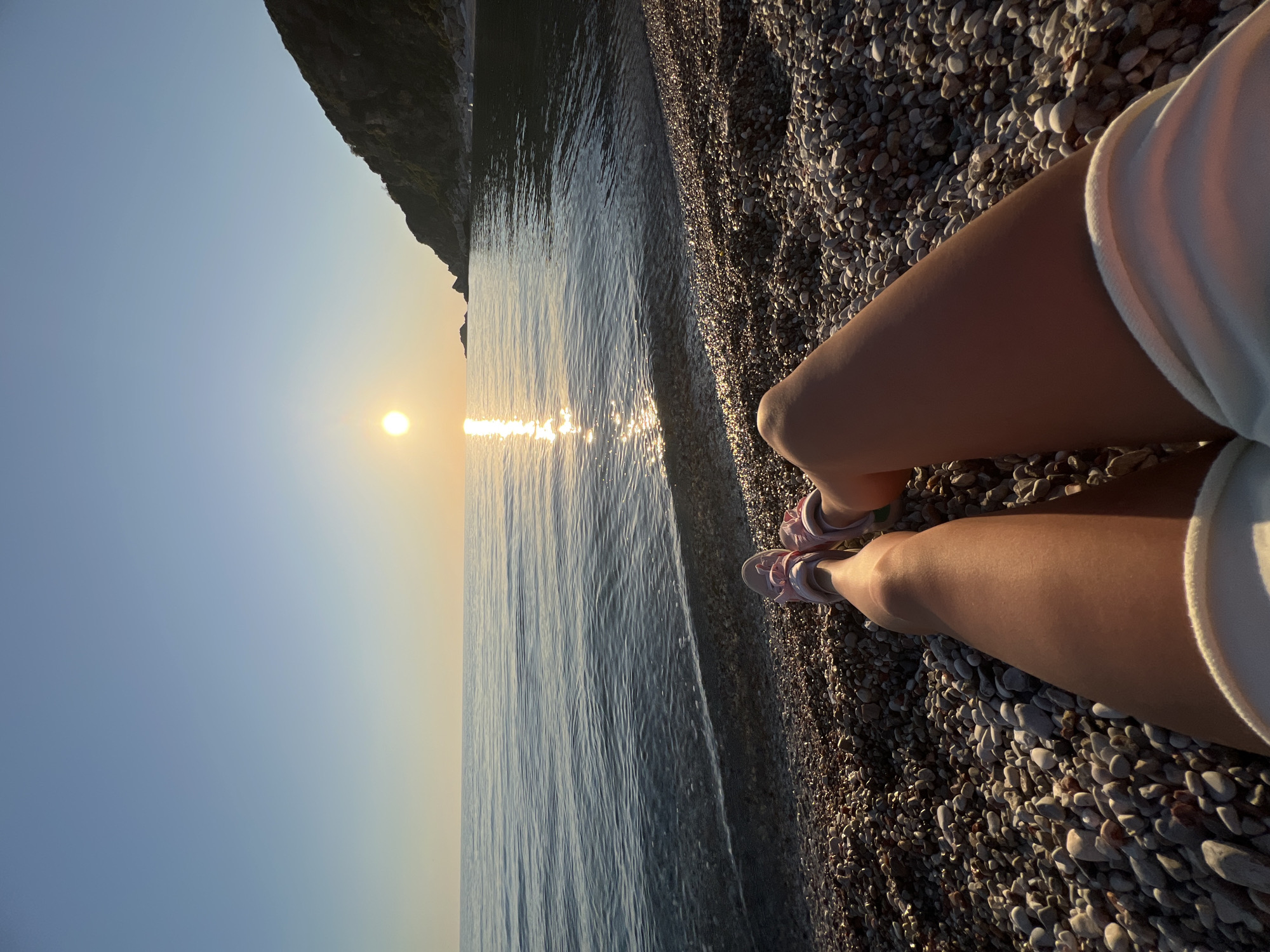 The image captures a tranquil scene at the beach in Mirište, Montenegro. The viewer's perspective is from a seated position on the pebbled beach, showcasing the legs of a person wearing white shorts and pink sandals. The calm, clear sea stretches out towards the horizon, reflecting the sunlight. A rocky cliff partially obscures the left horizon. The sky is a gradient of light blue, with a hazy effect near the sun. The overall atmosphere is peaceful and serene.
